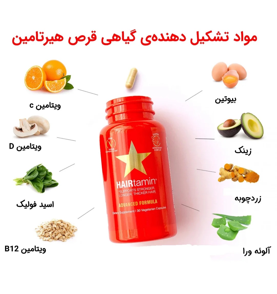 قرص هیرتامین hairtamin علاوه بر مو، بر روی رشد ناخن و سلامت پوست نیز اثر مثبت و خوبی دارد. ترکیبات آن کاملا گیاهی و طبیعی است و یک مکمل عالی برای سلامت مو میباشد.