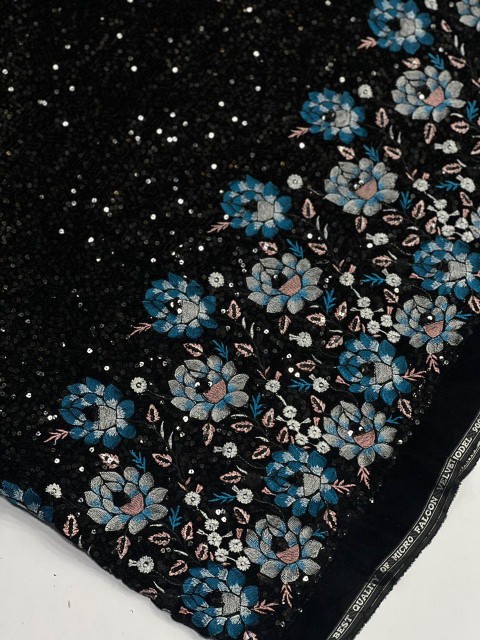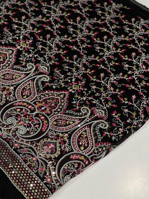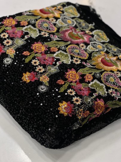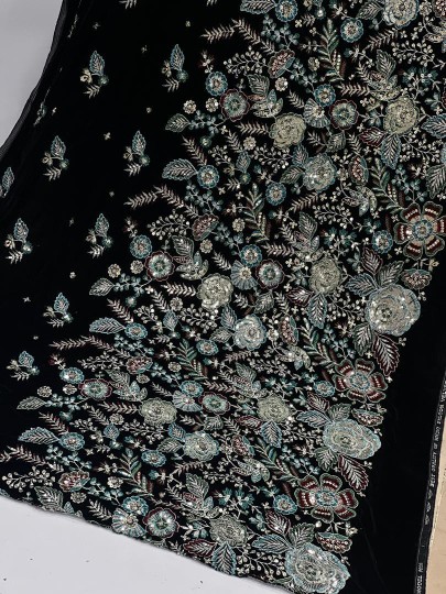 - پارچه مخمل سوزندوزی مشکی کار شده مناسب لباس شب فروش متری